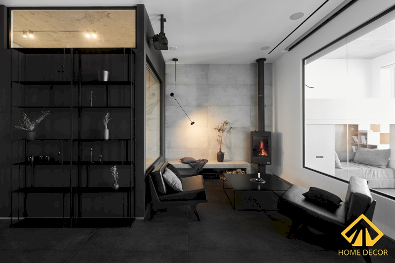 Bộ ghế sofa mà chúng tôi sử dụng là dáng chất liệu bằng gỗ sơn đen với lớp đệm da đặt ở bên trên. Thay vì sử dụng kệ tivi như bình thường thì Home Decor đã đem thiết bị điện tử công nghệ mới như máy chiếu để dùng. Chỉ cần kéo tấm chắn màu trắng xuống ở cửa kính phòng ngủ là đã có thể bật máy chiếu xem màn hình rộng rồi. Vừa tiện nghi mà cũng ấn tượng bởi sự tối giản trong mọi đồ đạc trong nhà.