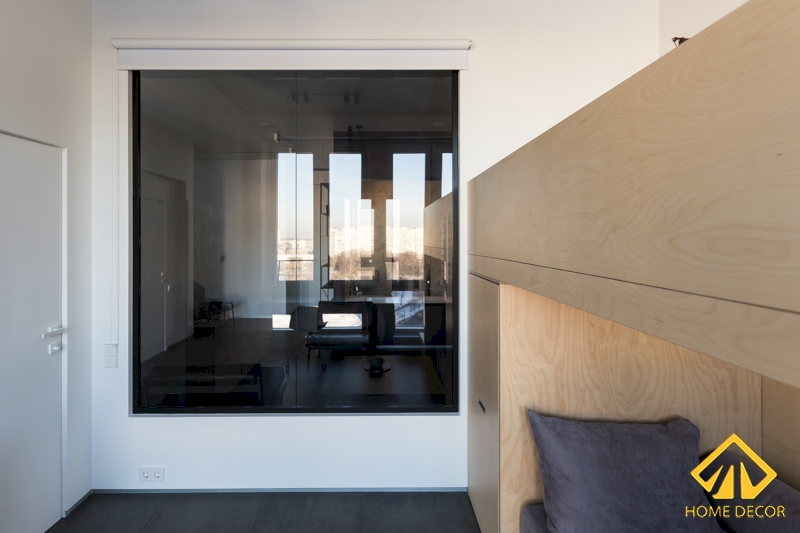 Ngay bên cạnh chiếc giường ngủ này chính là khung cửa kính to giúp đón nhận ánh sáng tươi mới vào phòng thay vì để căn phòng nhìn tổng thể sáng sủa hơn.