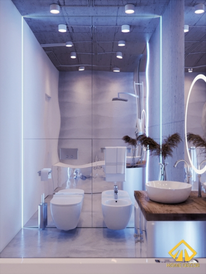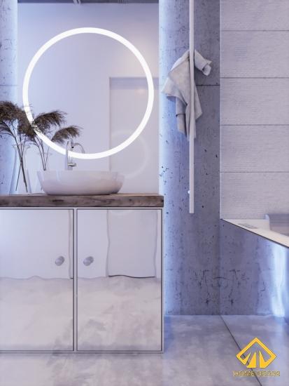Trong phòng vệ sinh này, Home Decor đã sử dụng chủ yếu chất liệu nhôm tráng gương không gỉ đề mang đến cái nhìn ảo ảnh, mơ hồ cùng với nét hiện đại.