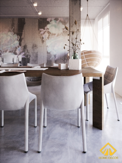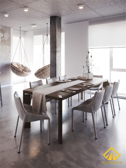 Bàn ăn cũng được sử dụng bằng đồ gỗ nội thất cao cấp với tone màu nâu sẫm giúp làm nổi bật hoàn toàn trên nền trắng xám này. Không chỉ vậy, kết hợp với bàn ăn này là bọ ghế 8 người được thiết kế với chất liệu nhung trắng xám vô cùng đẹp và sang trọng.