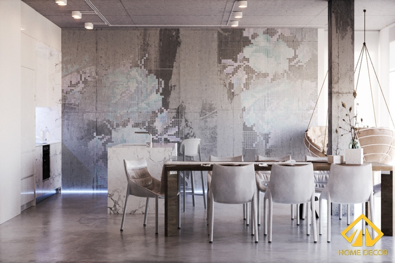 Điểm mà anh Hoàng và chị vợ vô cùng thích thú đó chính là không gian phòng bếp nấu nướng vừa hiện đại mà lại thông minh. Cũng giống như khu vực phòng khách mọi thứ tường, gạch đều được sử dụng giống nhau nhằm mang đến cảm giác đồng nhất với nhau. Nhưng vì phòng bếp nấu ăn có bức tường to và rộng hơn nên Home Decor đã nảy ra ý định sơn thêm những họa tiết hoa trên bề mặt đó.