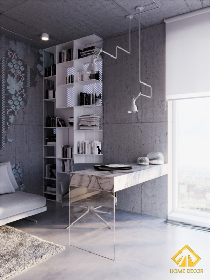 Vừa có tivi, ghế sofa mà hơn hết đặc biệt chú ý là chiếc kệ giá sách theo ô chữ nhật xen kẽ lệch nhau vô cùng ấn tượng.