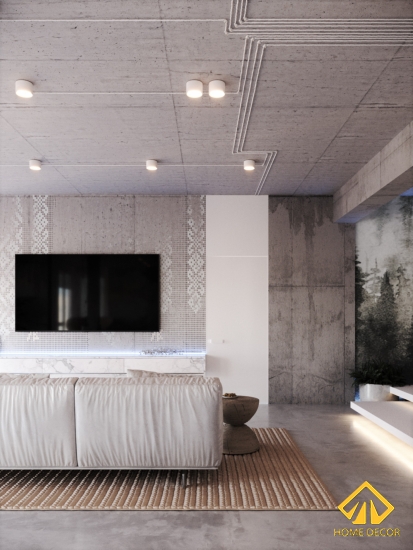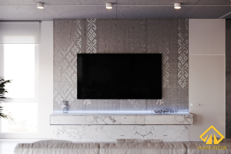Đối với vị trí tivi thì được gắn trực tiếp trên nền gạch xám đậm chấm. Để giúp cho không gian đó không bị quá nhàm bởi nét trơn nên chúng tôi đã thiết kế thêm những họa tiết đường vân hoa thẳng giúp cho tấm tường vách đó không bị nhàm chán. Kệ tủ tivi chắc chắn sẽ là thứ không thể thiếu được trong gia đình nhà anh Hoàng. Home Decor lựa chọn kệ tủ vi với dáng thân dài nhưng hẹp được gắn trực tiếp trên tường vách đó. Mẫu mà chúng tôi lựa chọn chính là loại mẫu màu trắng vân đá to bản hơn so với sàn gạch nhằm mục đích tránh trùng với nhau sẽ không còn nổi bật.