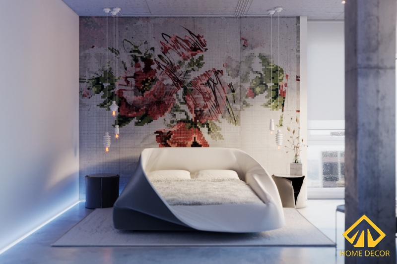Phòng ngủ được thiết kế độc đáo với không gian diện tích nhỏ gọn. Chiếc giường ngủ mà Home Decor lựa chọn là mẫu giường ngủ đệm mút có thể dựng lên hoặc ép xuống dưới dễ dàng. Chiếc đèn led màu xanh sẽ được gắn ngay xuống dưới nền gạch nhằm tạo cảm giác hiện đại và thông minh thêm hơn cho căn phòng.