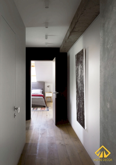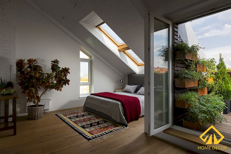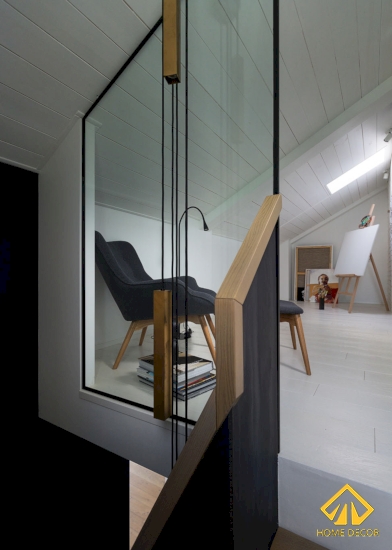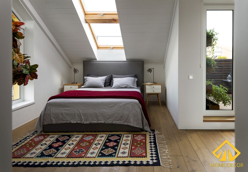 Nơi đây cũng được thu nhỏ bên trên gác mái, nhưng khác ở điểm giường ngủ được đặt đối diện tủ quần áo và tránh đi tấm kính áp mái. Thay vào đó là bàn học tập làm việc thì được đặt ở bên dưới tấm kính cửa sổ lớn nhằm đón nhận được nguồn ánh sáng tự nhiên, bầu không khí trong lành thoải mái.