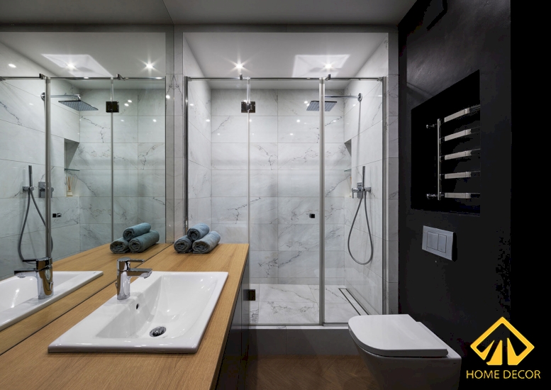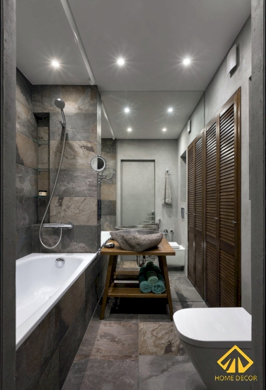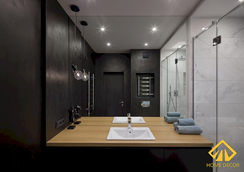 Home Decor vấn đảm bảo được yếu tố thẩm mỹ ban đầu anh Bảo đề ra là cần đến nét đjep tối giản. Bởi vậy mà bên trong các căn phòng vệ sinh sẽ đều mang màu sắc đen - trắng - nâu gỗ.