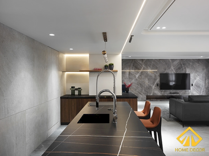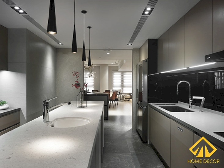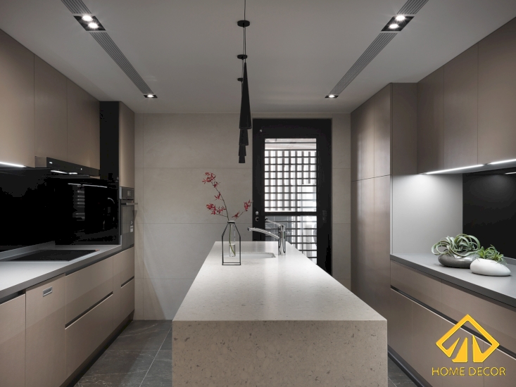 Tủ dàn bếp mà Home Decor lựa chọn được sắp xếp ở hai vị trí song song nhau, nằm giữa đó là chiếc bàn đá vân dùng để chế biến, bày biện.