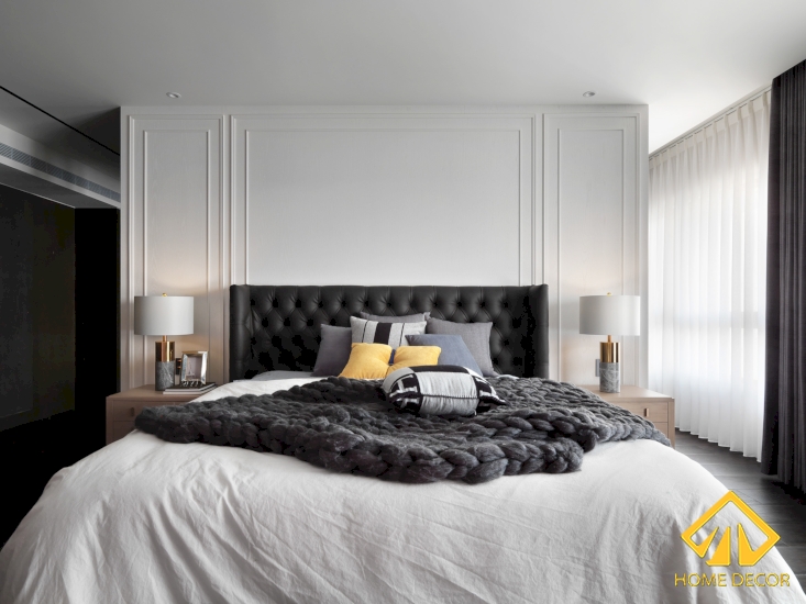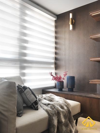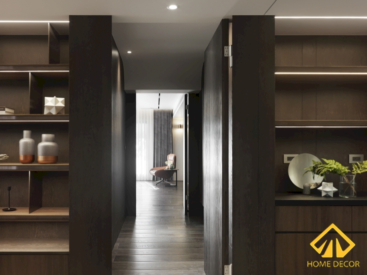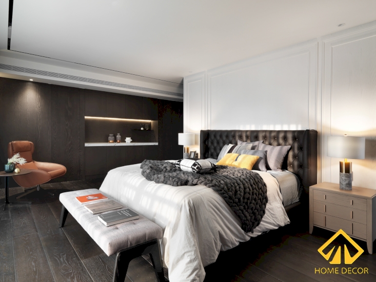 Căn phòng ngủ cũng được sử dụng chủ yếu bằng chất liệu gỗ nâu xám sang trọng từ nền sàn cho đến bức tường dọc dãy cửa đi vào. Còn các khu vực tường còn lại sẽ được thiết kế với dáng pháo chỉ sơn trắng nhằm mang đến màu sắc hài hòa hơn.