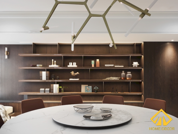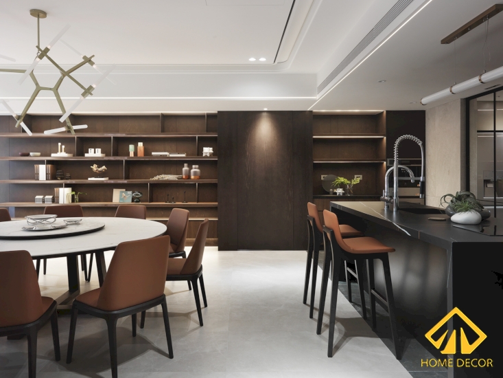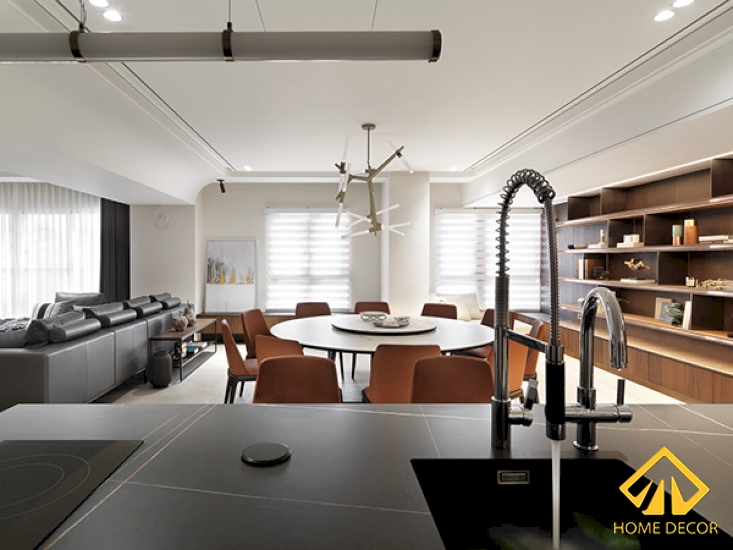 Ngay đằng sau của bộ ghế sofa đó chính là bàn ăn gia đình được Home Decor lựa chọn thiết kế theo dáng bàn tròn vừa tạo nên sự hiện đại mà đồng thời cũng mang đến sự tiện ích trong quá trình sử dụng.
