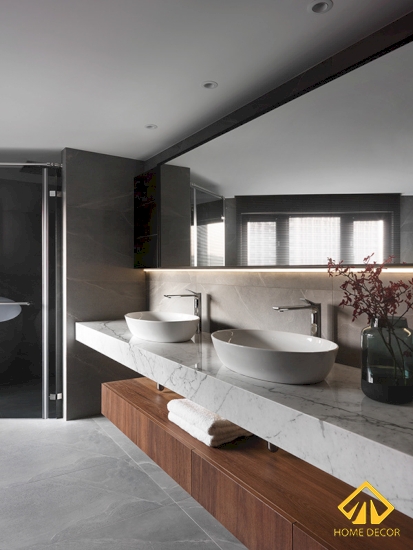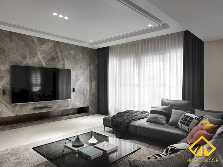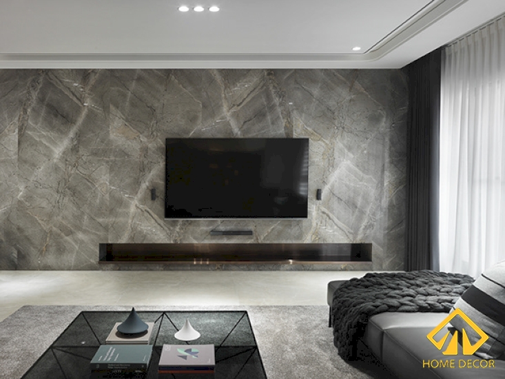 Đối với khu vực tivi thì bề mặt tường đó được thay thế lát toàn bộ bằng tấm đá cẩm thạch marble màu xám trắng vô cùng tinh tế và sang trọng. Hơn nữa, thay vì kệ tủ tivi thì Home Decor đã tạo nên một ngăn tủ sâu bên trong tấm đá đó vừa tiết kiệm được diện tích mà cũng mang đến vẻ đẹp tiện nghi, hiện đại.