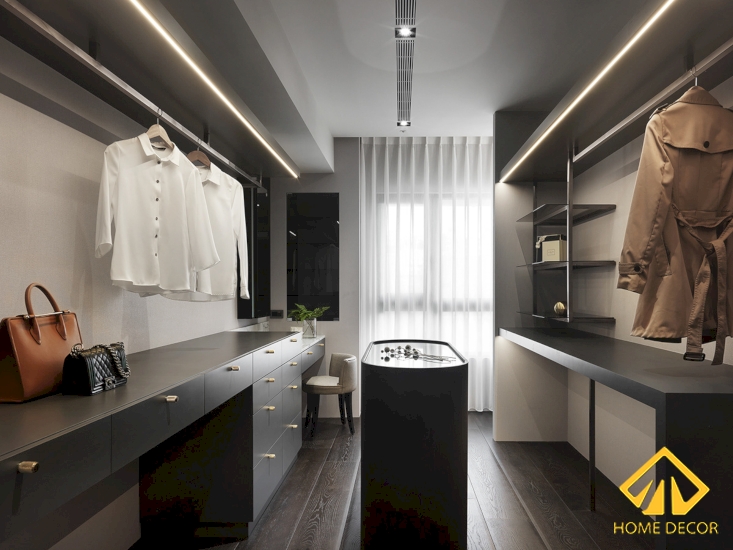 Ở đằng sau bức tường đầu giường đó chính là mở ra một căn phòng tủ quần áo với đầy đủ đồ gỗ nội thất như kệ tủ cho đến quầy tủ đứng dành cho đồ phụ kiện giá trị.