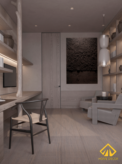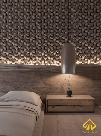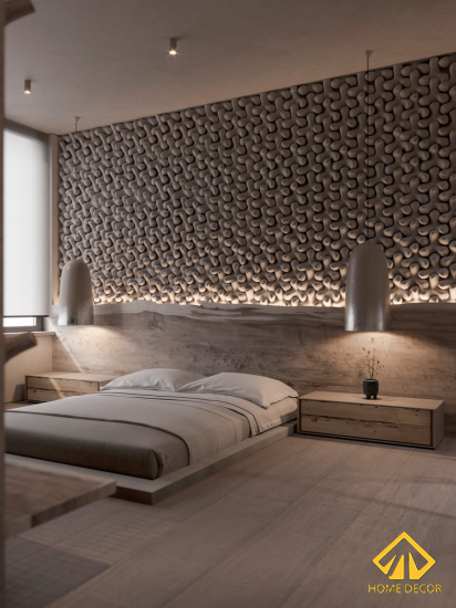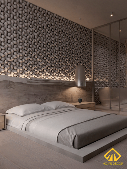 Tại đây, để mang đến điểm nhấn cuốn hút cho căn phòng thì thay vì sử dụng bức tường sơn thông thường thì Home Decor lựa chọn ngay những chi tiết họa tiết 3D màu kem được sắp xếp liên kết gắn với nhau. Đồng thời đầu tường dựa cũng như nền nhà sẽ được sử dụng hoàn toàn bằng chất liệu gỗ nâu nhạt giúp hài hòa, nhẹ nhàng mà vẫn mang đậm nét tinh tế.