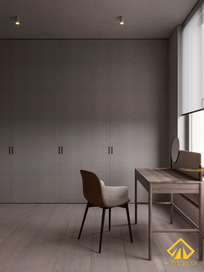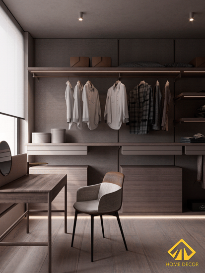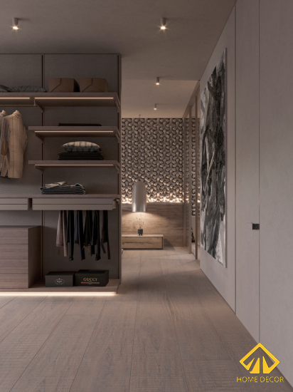 Hai bên sẽ đều là khu vực tủ quần áo với những chiếc kệ treo đồ, giá bày biện và bộ tủ gỗ nâu xám cao dài áp sát trần giúp mang đến một không gian hài hòa và kết nối được chung với phong cách cả căn nhà.