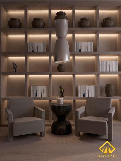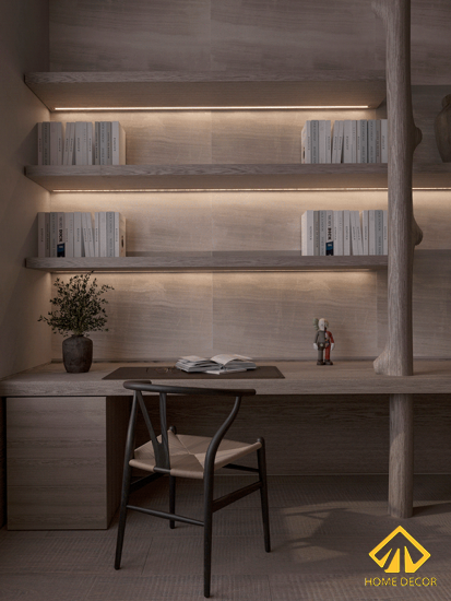 Chiếc bàn làm việc được thiết kế khác lạ với cây gỗ dựng đứng cắm thẳng liền mạch với bề mặt bàn làm việc. Ngay bên cạnh đó chính là hai ghế tựa đặt ngay ngắn đằng trước kệ tủ gỗ ô vuông vô cùng đẹp mắt. Tại đây vừa dùng để bày biện trang trí mà cũng là nơi giúp gia chủ có thể thư giãn đọc sách và nghỉ ngơi.