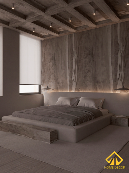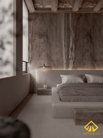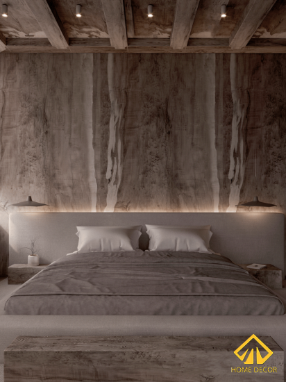 Bức tường trên đầu giường được Home Decor thiết kế đặc biệt với tấm gỗ bản to, đường vân gỗ đa dạng và sắc nét. Chiếc giường ngủ thì được sử dụng kết hợp khung đệm viền bằng vải cứng nên đã mang đến sự độc đáo và khác biệt so với các loại thông thường.