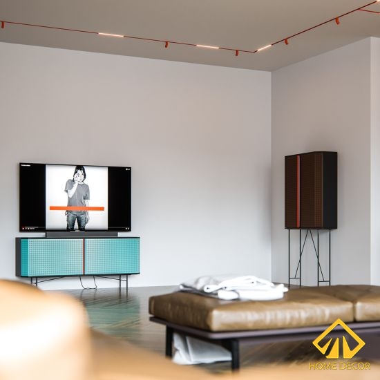Đối diện với đó là duy nhất chiếc kệ tivi cùng bộ loa dàn âm thanh. Với mục đích yêu cầu thiết kế chung cư với phong cách tối giản nên chúng tôi đã lựa chọn những sản phẩm có kích thước không quá lớn. Nhờ có đồ nội thất này mà càng giúp tạo thêm cho không gian được rộng và phương hướng mở.