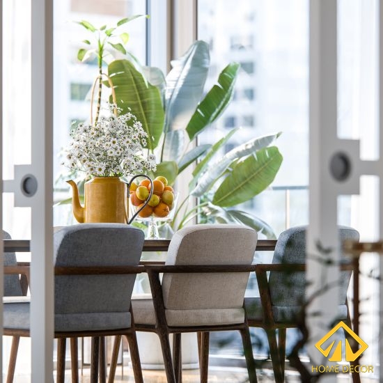 Bộ bàn ăn sẽ được sắp xếp thiết kế đi sang một phòng bên khác với mặt kính rộng to nên có thể nhận hết ánh sáng tự nhiên. Home Decor vẫn giữ nguyên yêu cầu của chị Hồng Anh đề xuất ban đầu là cần mọi thứ tối giản những song song vẫn là nét đẹp hiện đại nên chúng tôi sử dụng bộ bàn ăn bằng gỗ màu nâu trên nền tường nền kính màu trắng. Với sự kết hợp hài hòa giữa hai màu này sẽ càng tạo nên nét đẹp nhẹ nhàng, hiện đại.