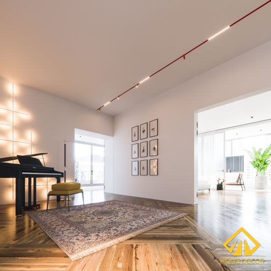 Nền nhà được sử dụng hoàn toàn bằng chất liệu gỗ với đường vân sắc nét. Kết hợp cùng với đó sẽ là tường và trần sơn màu trắng tinh giúp tổng thể căn nhà toát lên được nét đẹp hiện đại mà vẫn tối giản mọi thứ. Trần nhà được thiết kế vô cùng độc đáo và ấn tượng với lắp đặt những đường dây đèn sáng từng khúc xuyên suốt cả căn chung cư 80m2. Với sự đột phá thiết kế này khiến chị Hồng Anh rất thích thú và ấn tượng bởi nét đẹp độc đáo.