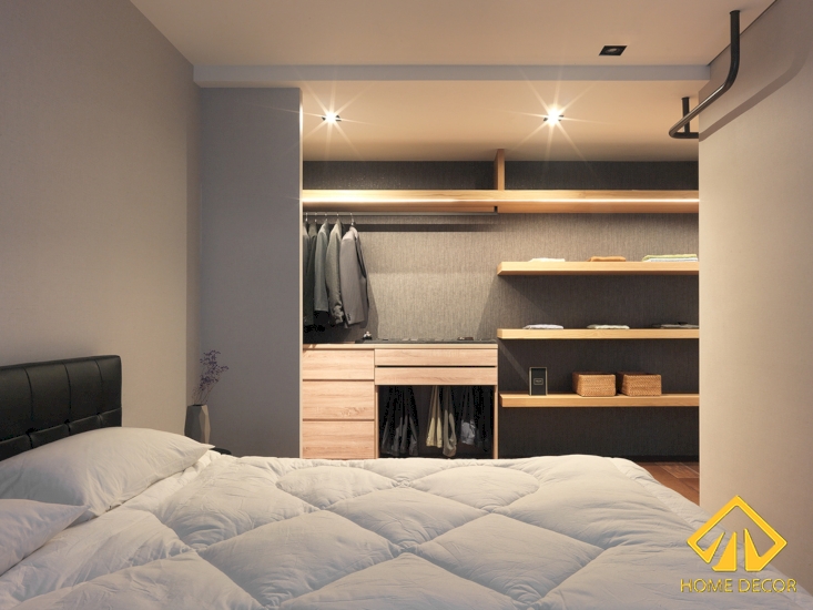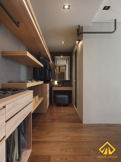 Cùng với đó chính là giúp cho khu vực tủ quần áo bằng gỗ nâu được tôn lên nét đẹp nổi bật. Khu vực này có chiều dài sâu chính vì thế mà Home Decor tận dụng để làm khu vực bày biện đồ dùng, chứa đựng quần áo phụ kiện và còn là nơi đặt bàn trang điểm nữa.