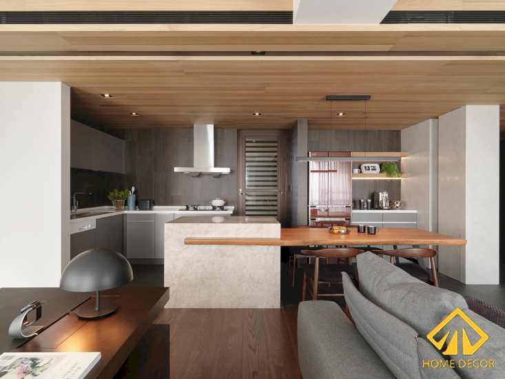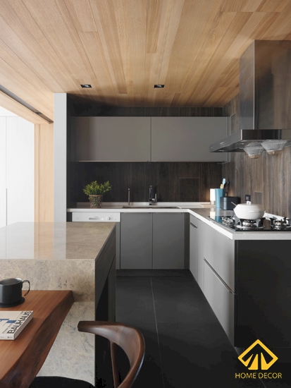Nếu bên dưới phòng khách là khu vực làm việc thì phía bên cạnh sẽ là phòng bếp nấu nướng. Nơi đây được coi như là ngọn lửa của gia đình, chính vì vậy mà cần đến những gam màu ấm cúng, hiện đại. Nên Home Decor đã lựa chọn dùng ngay các đồ gỗ nội thất nhằm tạo dựng được màu sắc ấm và nhẹ nhàng cho gian bếp của nhà anh Tuân.