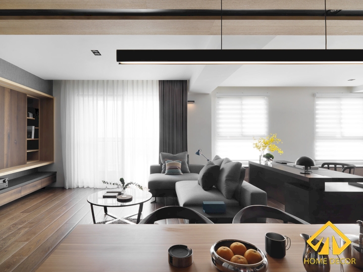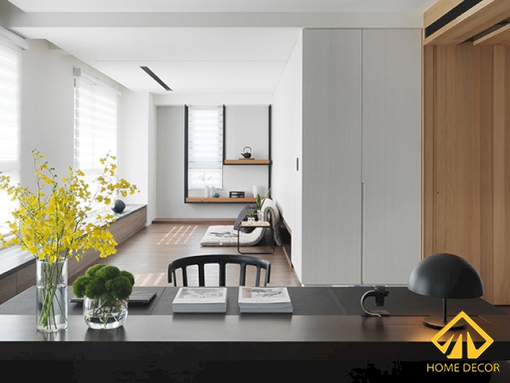 Trong thiết kế nội thất chung cư, Home Decor cũng có đưa ra thêm một ý tưởng độc đáo đó chính là sử dụng khoảng trống sau lưng phòng khách để làm nơi khu vực bàn làm việc cũng như là nơi thư giãn, nghỉ ngơi.