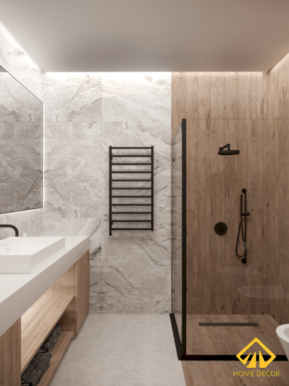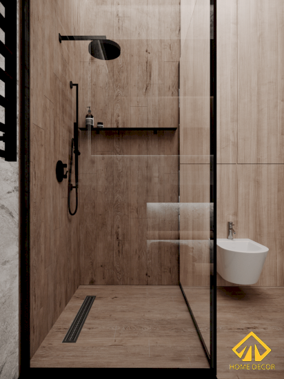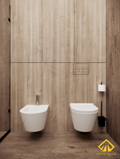 Cũng giống như mấy căn phòng kia đang đáp ứng đúng yêu cầu thiết kế chung cư anh Trọng ban đầu đề ra là cần thiên hướng chất liệu gỗ nâu. Bởi vậy mà ở khu vực phòng vệ sinh này chúng tôi cũng lựa chọn sử dụng mẫu gỗ luôn. Tuy nhiên, kết hợp chung với đó sẽ là tone màu trắng nhằm tạo nên sự tối giản và ấm cúng.