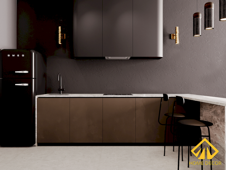 Cũng như khu vực phòng khách có diện tích nhỏ gọn thì đặt ngay bên cạnh đó cũng là không gian phòng bếp nấu nướng với đầy đủ tiện nghi cần thiết. Liền mạch chung với bức tường đen nên Home Decor sử dụng luôn các đồ vật dụng tủ dàn bếp màu đen và tủ lạnh cũng màu đen.