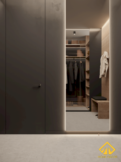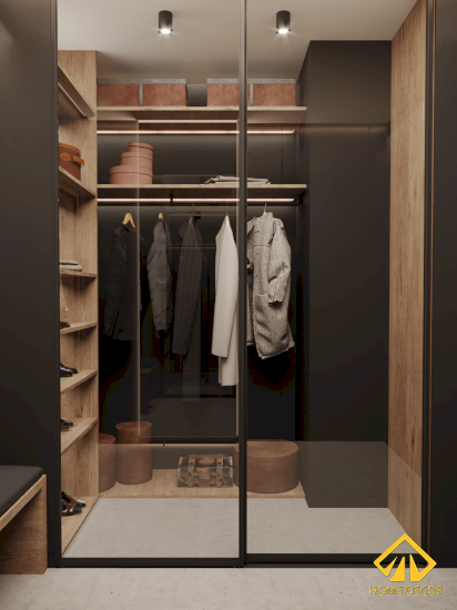 Ở phòng tủ đồ kính đó được thiết kế đặt nằm bên ngoài gần cửa ra vào và phòng vệ sinh nhằm tạo nên được sự thuận tiện mà cũng có nên không gian tách biệt. Hầu hết tủ quần áo đều được thiết bằng chất liệu gỗ nâu sang trọng và chắc chắn.