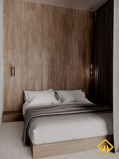 Chiếc giường ngủ được đặt gọn gàng kê sát vào đầu tường lát gỗ nâu sang trọng. Mẫu giường cũng được sử dụng luôn bằng chất liệu gỗ nhằm tạo nên một không gian ấm cúng. Nơi đây cũng tiện nghi bởi dễ dàng quan sát không gian bên ngoài mà cũng có đầy đủ đồ dùng cần thiết trong phòng.
