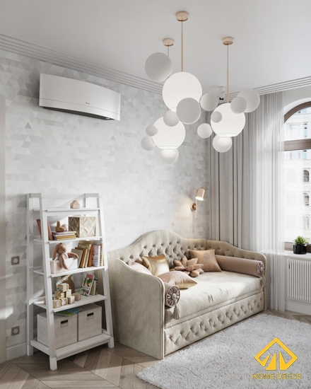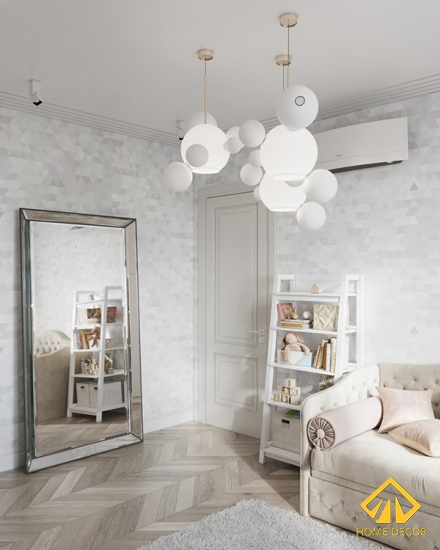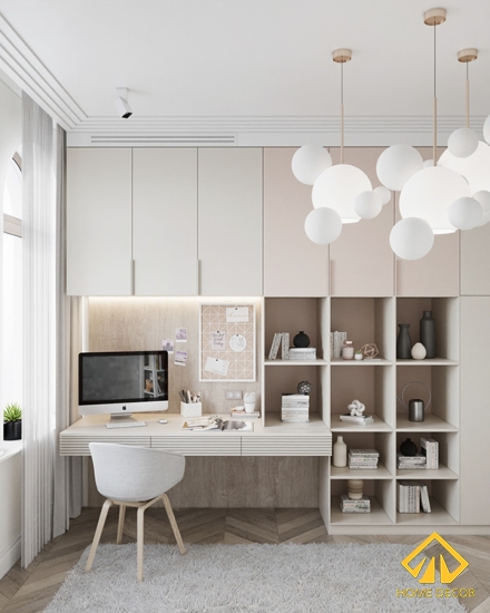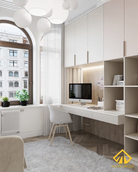 Trong căn nhà còn có thêm một phòng riêng chỉ duy nhất dùng để làm việc hoặc thư giãn vui chơi. Ở đây Home Decor lựa chọn màu sắc chủ đạo là tone trắng kem giúp trong khoảng thời gian làm việc chúng ta sẽ có cảm giác thoải mái và khơi gợi được nguồn cảm hứng làm việc hiệu quả hơn.
