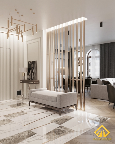 Đi từ ngoài cửa đi vào, chúng ta có thể cảm nhận rất rõ ràng độ tinh tế, sang trọng ở ngay trước mắt. Qua những chi tiết đồ gỗ nội thất như ghế ngồi đi giày, kệ bàn gỗ, khung vách phân chia hai khu vực phủ sơn vàng gold,..