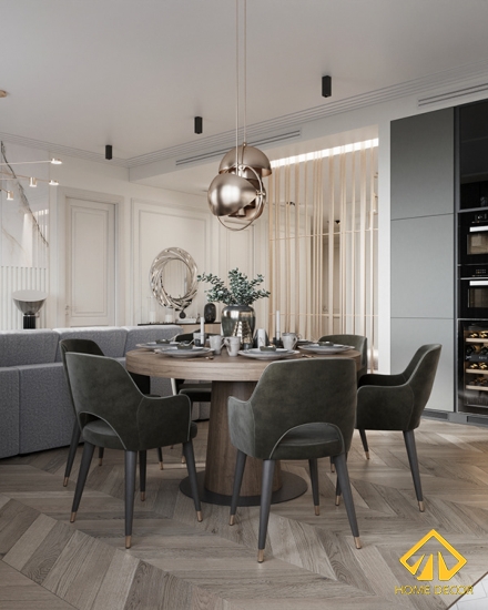 Bộ bàn ăn khác với mẫu thông thường là dáng bàn chữ nhật hoặc bàn oval. Thì tại thiết kế căn chung cư của anh Nghĩa thì Home Decor đã sử dụng dáng bàn hình tròn bằng chất liệu gỗ tự nhiên. Kết hợp chung với bàn chính là bộ ghế bằng chất liệu da lộn màu xám xanh rêu góp phần thêm nét đẹp tinh tế và sang trọng.