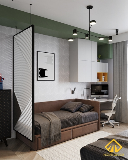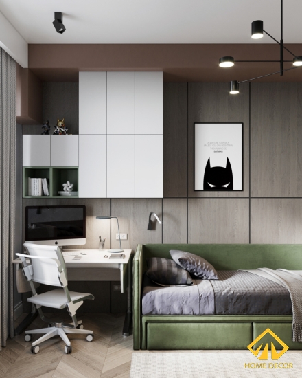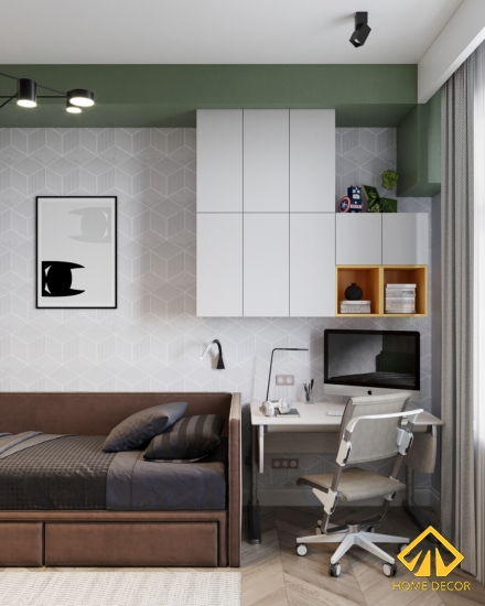 Chiếc bàn làm việc được Home Decor thiết kế vừa khít chung với chi tiết pháo chỉ trên tường nhằm tạo nên cảm giác không gian thoải mái và tự do hơn. Ngay cạnh đó chính là chiếc tivi gắn trực tiếp trên tường và kệ tủ tivi chân cao màu đen trắng đặt bên dưới. Với sự sắp xếp này mang đến cảm giác thoải mái và dễ chịu cho bất cứ ai.