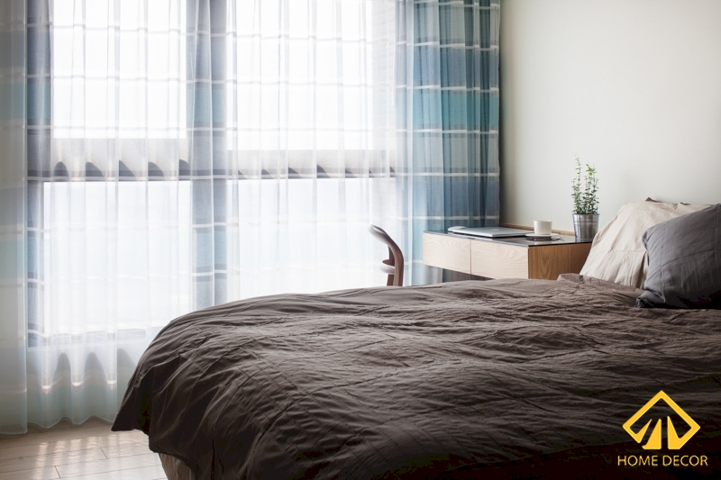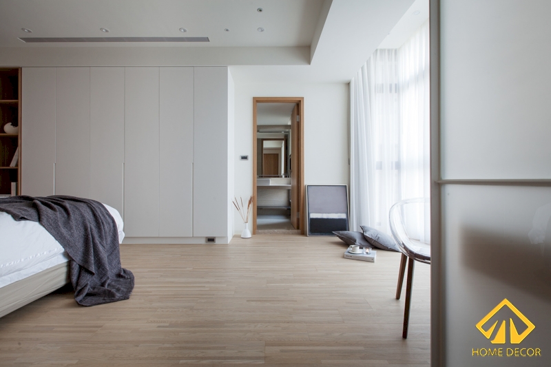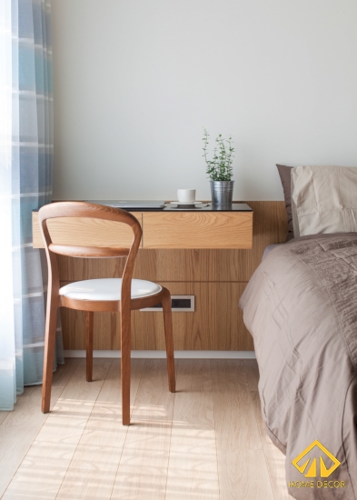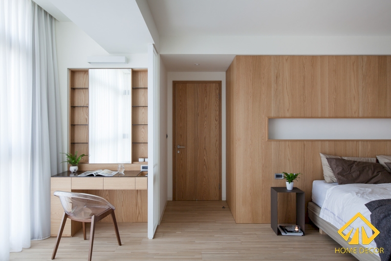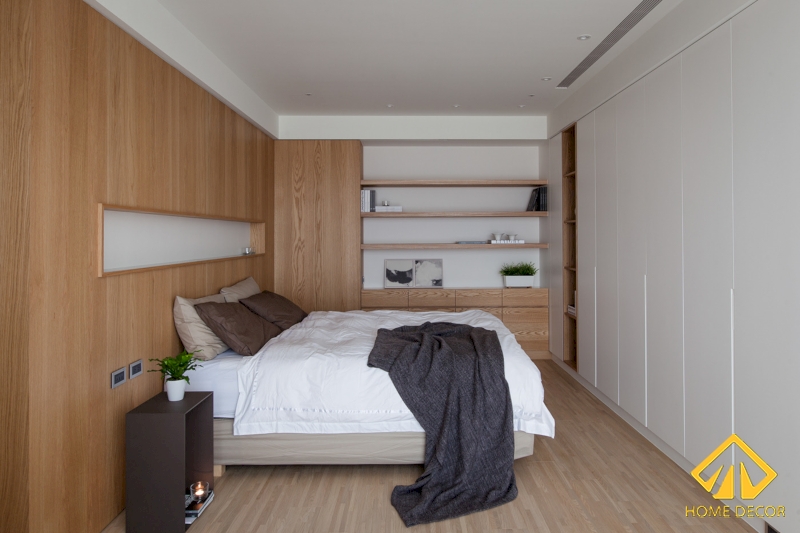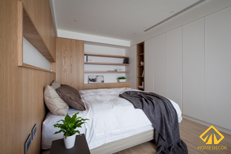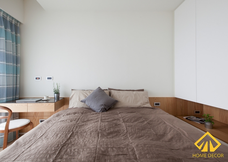 Đầu tiên bước đến căn phòng ngủ có diện tích dài theo chiều dọc. Vẫn như không gian xung quanh của căn nhà thì cần có tone màu trắng và nâu gỗ. Chiếc giường ngủ mà Home Decor lựa chọn có chất liệu gỗ nâu sáng thiết kế liền kề với tủ đầu giường, bàn làm việc và cả men dọc tủ quần áo nữa.