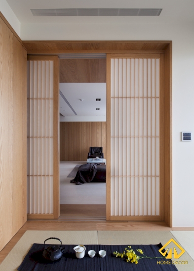 Bước vào căn phòng trà đạo này sẽ thấy một cánh cửa kéo thiết kế theo dáng cổ điển của người Nhật. Cùng với đó chính là một tấm thảm ngồi có tone màu trắng và be nhằm tạo nên sự đồng điệu và hài hòa chung với cả căn chung cư.