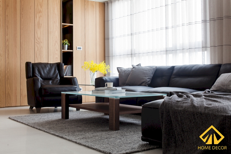 Bộ ghế sofa mà Home Decor đặt trong khu vực phòng khách là mẫu có chất liệu da mềm màu đen. Lý do mà lại lựa chọn màu đen trên nền trắng - nâu gỗ này là bởi sẽ giúp tôn lên được vẻ đẹp của đồ nội thất cũng như tạo điểm nhấn.