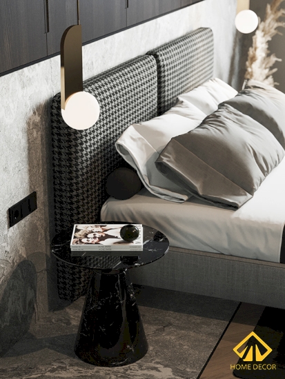 Đến với căn phòng ngủ đầu tiên của vợ chồng anh Thái sẽ được nhấn mạnh ở vị trí đầu giường có phần tường nửa trên lát gỗ nâu sẫm còn phía dưới được lát bằng tấm gạch vân cẩm thạch vô cùng tinh tế và sang trọng.
