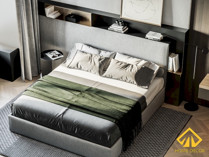 Bước tiếp với căn phòng ngủ thứ 2 trong chung cư anh Thái với thiết kế giường ngủ cỡ lớn có thành tựa giường vô cùng độc đáo bởi kết nối liền mạch chung với dáng kệ tủ nhỏ gọn màu đen.