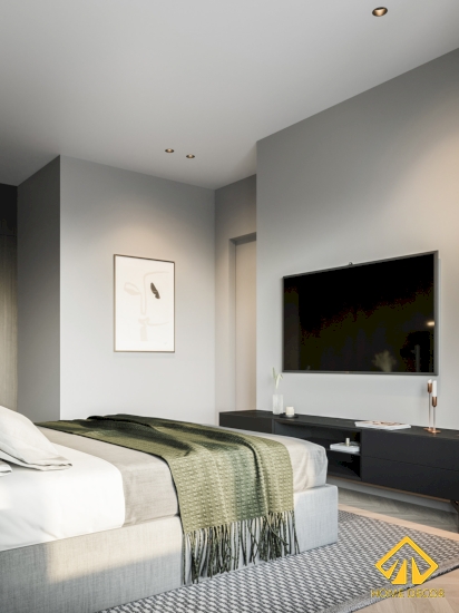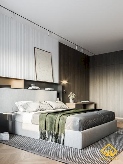 Căn phòng này đơn giản hơn bởi các gam màu chủ yếu tập trung đến đều là gam màu trung tính, tối giản. Tuy nhiên để đáp ứng được đúng với đề xuất ban đầu mong muốn không gian hiện đại và trẻ trung thế nên chúng tôi sử dụng nhiều đồ gỗ nội thất khác làm đẹp cho căn phòng như kệ tủ, khung tranh, bàn làm trang điểm,..