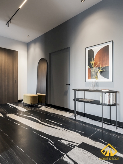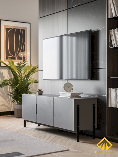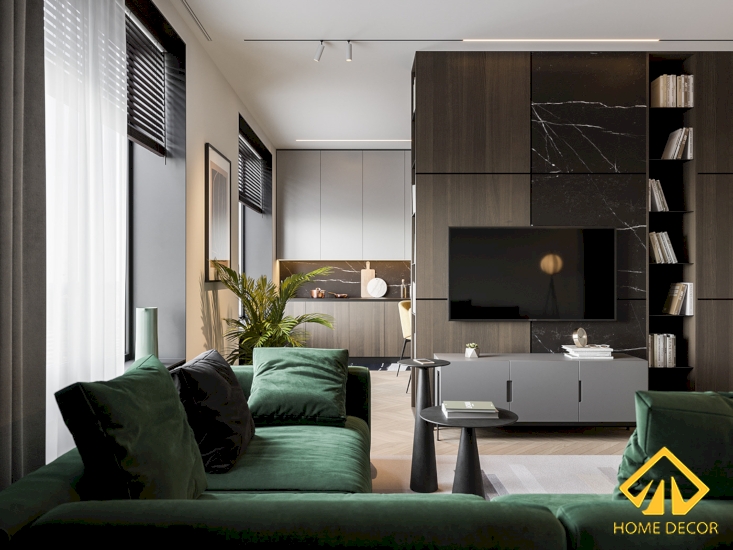 Để phân tách giữa hai không gian nên Home Decor có thiết kế ra một vách ngăn vừa là tạo không gian riêng mà còn là nơi để đựng đồ nữa. Chiếc tivi cũng được gắn gọn gàng ngay trên tấm vách đó với một bên tấm gạch vân đá màu đen lì và một bên gỗ nâu sẫm lì. Bên dưới là chiếc kệ tivi có chân đỡ cao nhằm vừa đồng nhất chung về màu sắc mà còn tiện lợi hơn trong quá trình lau dọn nhà.