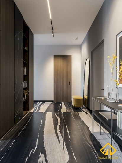 Ngay bên cạnh đó chính là chiếc tủ quần áo được lắp đặt độc đáo với bề mặt kính cường lực đen làm cánh cửa kéo ngang. Vừa tạo nên điểm khác lạ mà cũng tăng nét đẹp hiện đại trẻ trung ở trong đó.