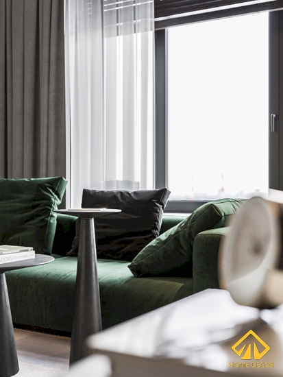 Không gian phòng khách nhỏ gọn chính vì thế nên mọi thứ đều được tiết kiệm tối đa diện tích mà vẫn thể hiện được nét đẹp trẻ trung trong căn. Chiếc ghế sofa được chúng tôi đặt gọn gàng ngay bên cạnh khung cửa sổ hình vuông nhằm mục đích đón nhận dễ dàng nguồn ánh sáng tự nhiên trong. Bộ ghế được lựa chọn có tone màu xanh rêu giúp nổi bật trên nền mà đồng thời cũng không dễ bị bám bụi bẩn.