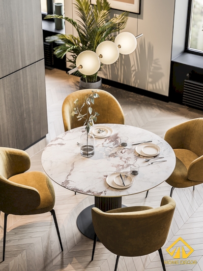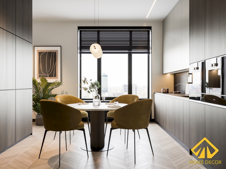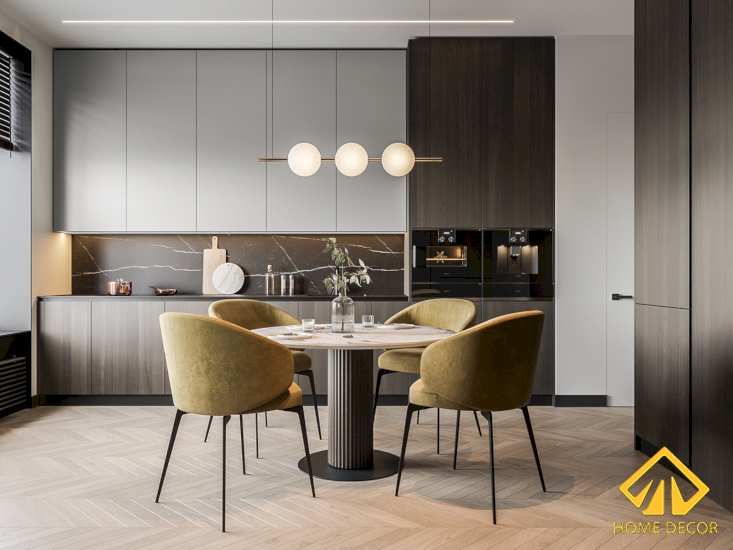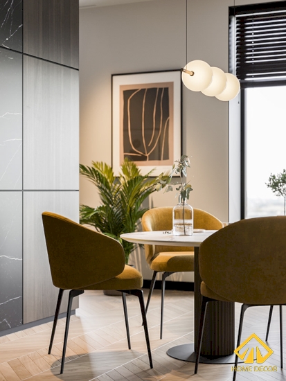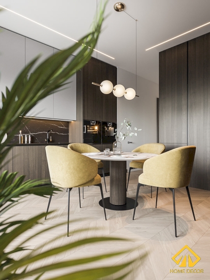 Song song với những vẻ đẹp của tủ dàn bếp mang lại thì Home Decor điểm vào thêm một bộ bàn ăn dáng bàn tròn vừa độc đáo và ấn tượng. Đặc biệt hơn cả là bốn chiếc ghế cho gia đình nhà anh Thái dùng bữa sẽ có chất liệu bằng da mềm màu vàng trẻ trung và hiện đại.