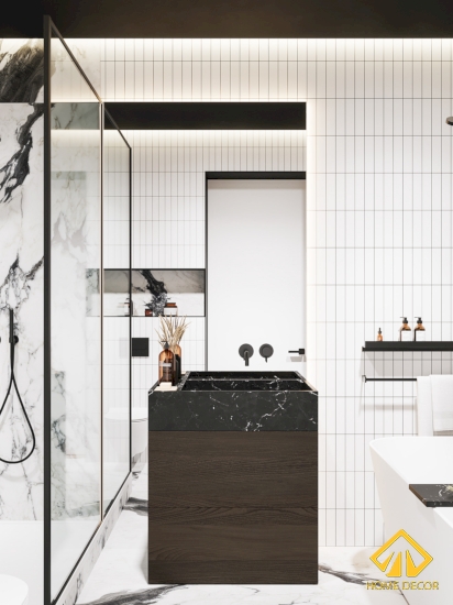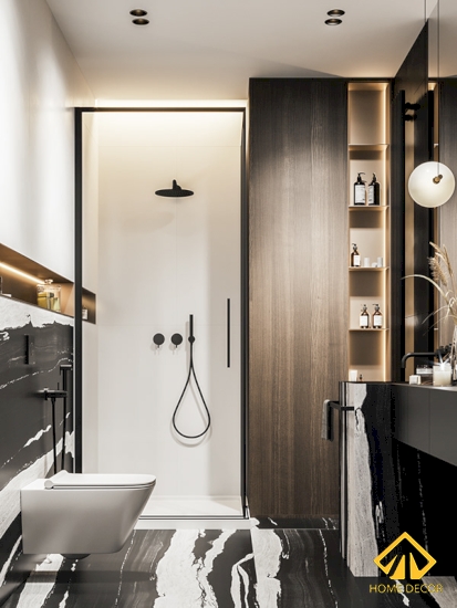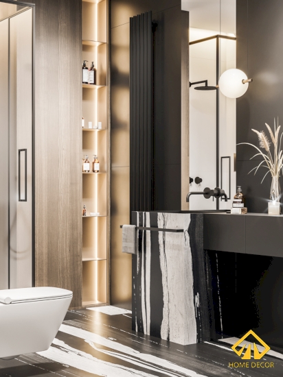Trong hai căn phòng vệ sinh này Home Decor lựa chọn sử dụng bằng chất liệu gạch cẩm đá nhằm tạo nên được sự tinh tế, hiện đại bên trong căn phòng.