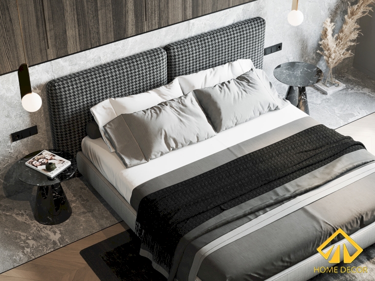 Cùng với đó chính là chiếc giường ngủ được dùng bằng chất liệu vải thô chắc chắn có họa tiết kẻ giúp vừa trẻ trung nổi bật cả căn phòng mà đồng thời cũng phù hợp với đối tượng dùng.