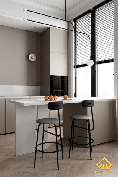 Bộ bàn ăn được anh Hiệp và Home Decor lựa chọn chính là dáng mẫu bàn tiện lợi màu trắng. Được kết nối trực tiếp với bàn bar dựng sát tường đã giúp tiết kiệm được diện tích một khoảng đáng kể. Hơn hết chúng tôi vẫn giữ nguyên tone màu trắng cùng với sắc trắng xám giống dàn tủ bếp nhằm tạo nên được sự đồng nhất khi nhìn tổng thể.