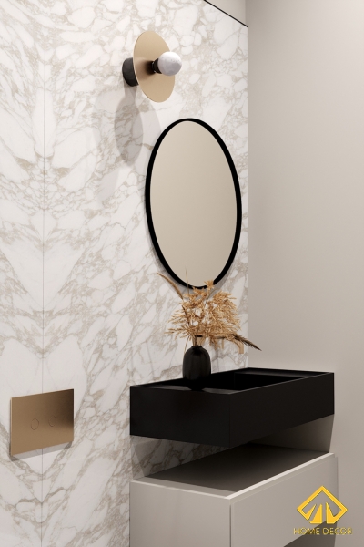 Ấn tượng nhất chắc chắn chỉ có thể là bộ bồn rửa mặt được đội ngũ Home Decor thiết kế độc đáo với dáng bồn hình chữ nhật màu đen, bên dưới chính là kệ tủ để đồ. Còn phía bên trên là dáng gương soi hình tròn được nhấn bằng đường viền kẻ màu đen.