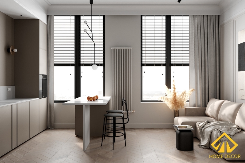 Vì diện tích căn chung cư của anh Hiệp chỉ vỏn vẹn từng này, thế nên mà mọi nội thất trong nhà sẽ đều vừa phải đáp ứng được đúng nhu cầu sử dụng mà vừa phải nhỏ gọn tối đa nhất có thể. Tại đây, Home Decor đã lựa chọn bức tường trắng tinh được phá cách bằng những đường viền kẻ giúp không bị trống trải quá nhiều. Cùng với đó chính là sàn nhà được lát nền gỗ nâu nhạt với các tấm vát chéo nhau, nhờ đó mà đã tạo nên một không gian màu sắc nhẹ nhàng. Đặt ngay bên cạnh khung cửa sổ lớn này chính là bộ ghế sofa không tay dựa. Không chỉ là mang đến nguồn ánh sáng tự nhiên nhất cho không gian phòng khách mà nhờ chiếc cửa sổ lớn đó đã gửi đến luồng không khí trong lành và mát mẻ.