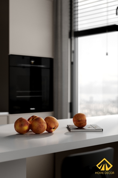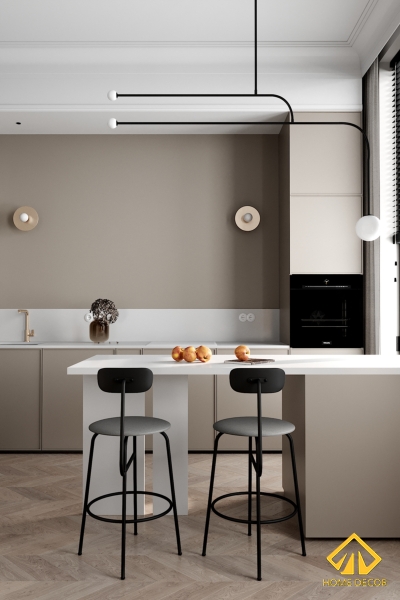 Vì diện tích căn chung cư có hạn, thế nên là chúng tôi đã sắp xếp không gian bếp nấu ăn nằm ngay cạnh phòng khách. Vừa mang đến một khoảng không nhỏ gọn tiện lợi mà gia chủ cũng dễ dàng di chuyển từ khu vực này sang khu vực kia.