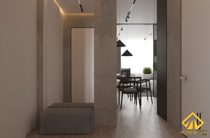 Bởi duy nhất có diện tích nhỏ gọn nên chúng tôi đã tận dụng mọi diện tích để sắp xếp sao cho các đồ gỗ nội thất được gọn gàng và tối ưu nhất có thể. Vẫn như yêu cầu mà chị mong muốn có được trong căn hộ là nét đẹp hiện đại, tinh tế và tối giản. Chính vì cần đảm bảo được nét tối giản trong căn chung cư này nên Home Decor chúng tôi đã sử dụng chủ yếu các tone màu như xám, trắng nhằm mang đến sự trẻ trung, giản đơn nhất có thể.
